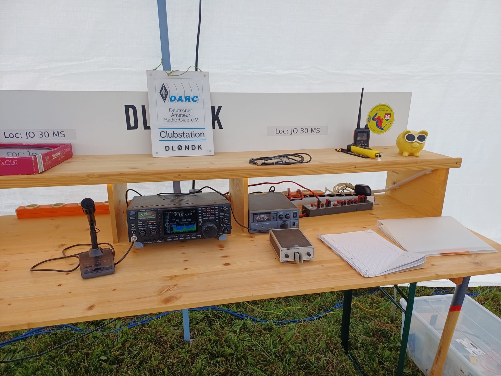 Im Gegensatz zum vorherigen Jahr blieben wir diesmal von Regen verschont. Auch waren die Temperaturen sehr angenehm, sodass der Aufbau flott vonstatten ging und wir uns alsbald ON AIR melden konnten. In diesem Jahr benannten unsere beiden „Jungspunde“ Rolf, DO5RJH, und Björn, DO1BSN, die Klubstation DL0NDK und sorgten für regen Betrieb und gute Laune am Mikrophon.